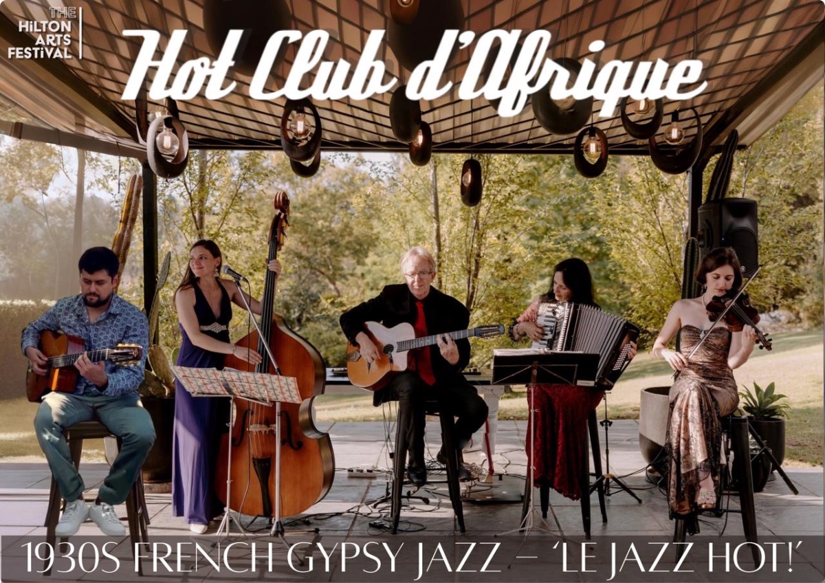 Hot Club d’Afrique is an all-acoustic Gypsy Jazz quartet originally from Johannesburg, South Africa. Their music pays tribute to the original “Quintette du Hot Club de France”, founded in 1934 by Django Reinhardt and Stéphane Grappelli. The Hot Club name refers to the Swing jazz of the 1930s, known at the time as ‘hot jazz’, or in France, as ‘le jazz hot’. Hot Club d’Afrique was founded in Johannesburg in 2008 by husband-and-wife duo Kevin Drummond on guitar,and Theodora Drummond on the piano accordion. Sharing a mutual love for the music of Django Reinhardt, they formed the first South African Gypsy Jazz band with other local musicians. The band’s current formation has been performing together since 2012, with Katharina Alexandra Rodriguez-Lopez on double bass and vocals, singing French and English romantic songs of the 1930s and beyond, and Frances van der Walt on violin and rhythm guitar. The newest addition to the band is Chilean guitarist, Nicolás Rodríguez-López.